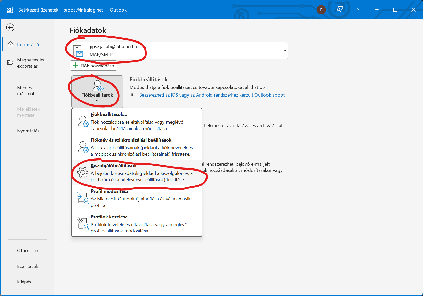 Az Outlook 365 (új nevén Outlook Classic) beállításaiban a bejövő és kimenő levelek kiszolgálójának nevét kell módosítani a cpanel.intralog.hu-ról mail.sajat-domain-nevem.hu-ra, ahol a „sajat-domain-nevem.hu” az ön e-mail címének a @ jel utáni része.