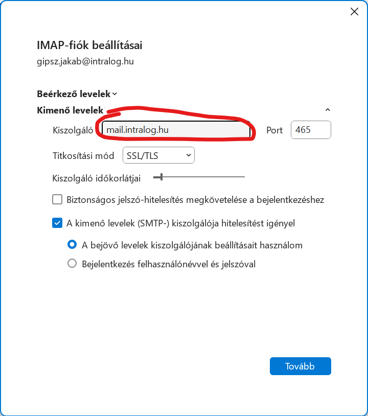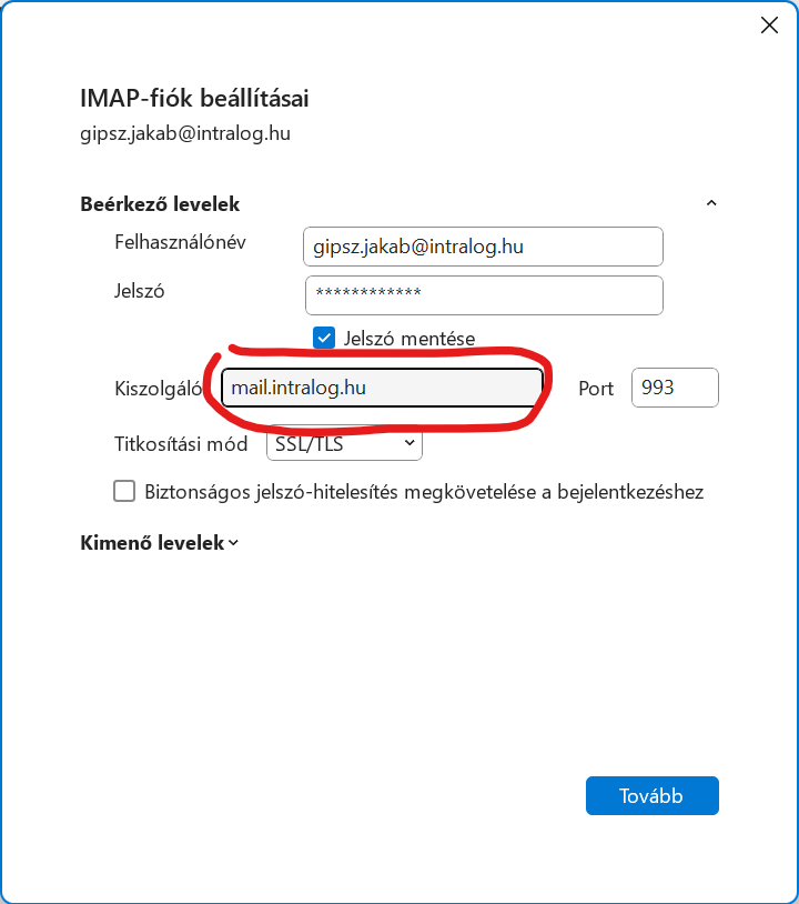 A Beérkező levelek szakaszban módosítsa a kiszolgáló nevét cpanel.intralog.hu-ról mail.sajat-domain-nevem.hu-ra, ahol a „sajat-domain-nevem.hu” az ön e-mail címének a @ jel utáni része. Ne a képen látható mail.intralog.hu kiszolgálónevet használja, hanem az ön e-mail címének megfelelőt: